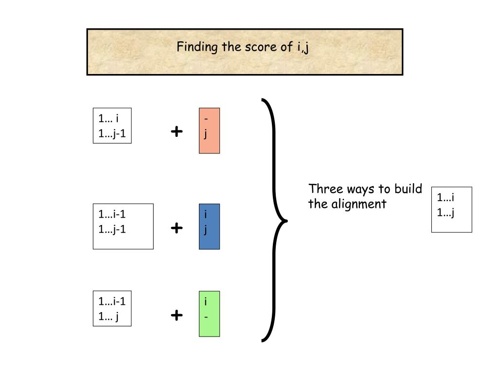 Finding the score of i,j 1…i 1…j In order to Compute the score of All we need are the scores of: 1….i 1…j-1 1…i-1 1….j 1…i-1 1…j-1