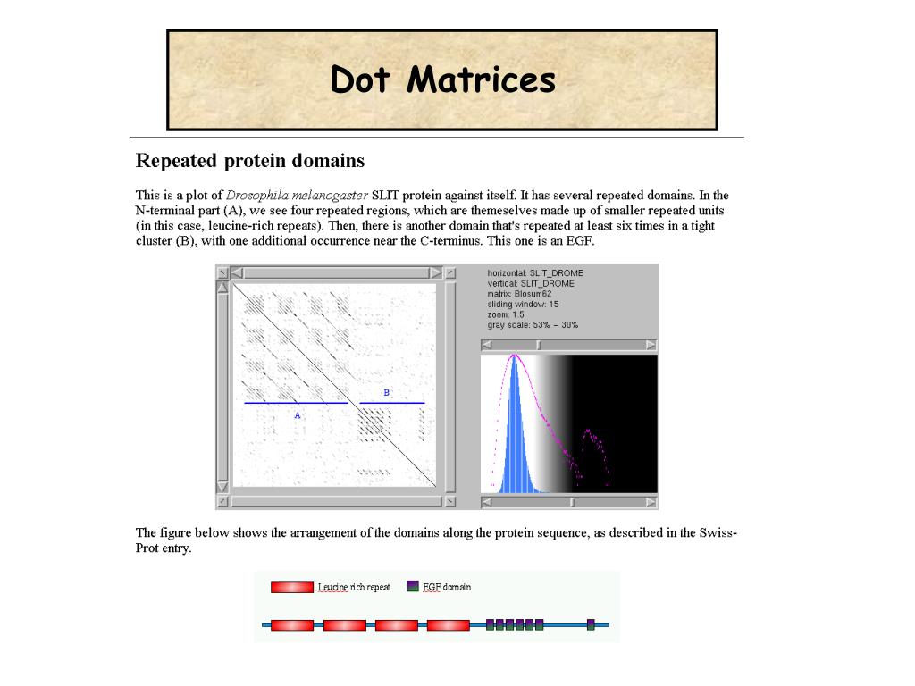 wheat --DPNKPKRAMTSFVFFMSEFRSEFKQKHSKLKSIVEMVKAAGER | | |||||||| || | ||| ||| | |||| |||| ????? KKDSNAPKRAMTSFMFFSSDFRS----KHSDL-SIVEMSKAAGAA -DoesNOTprovide us with an ALIGNMENT Dot Matrices Limits -Visual aid -Best Way to EXPLORE the Sequence Organisation