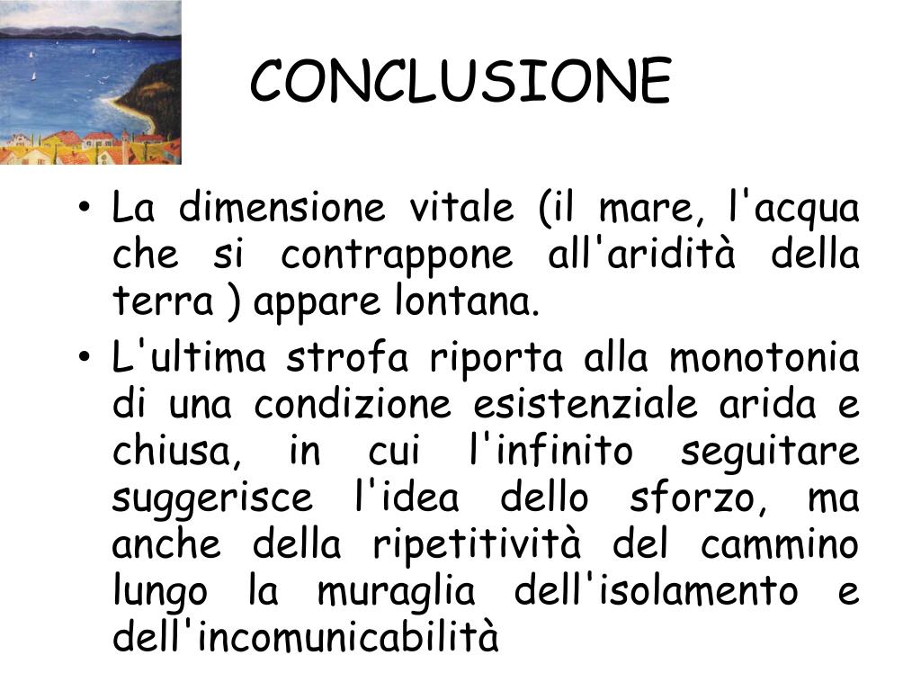 CONCLUSIONE • La dimensione vitale (il mare, l'acqua che si contrappone all'aridità della terra ) appare lontana. • L'ultima strofa riporta alla monotonia di una condizione esistenziale arida e chiusa, in cui l'infinito seguitare suggerisce l'idea dello sforzo, ma anche della ripetitività del cammino lungo la muraglia dell'isolamento e dell'incomunicabilità