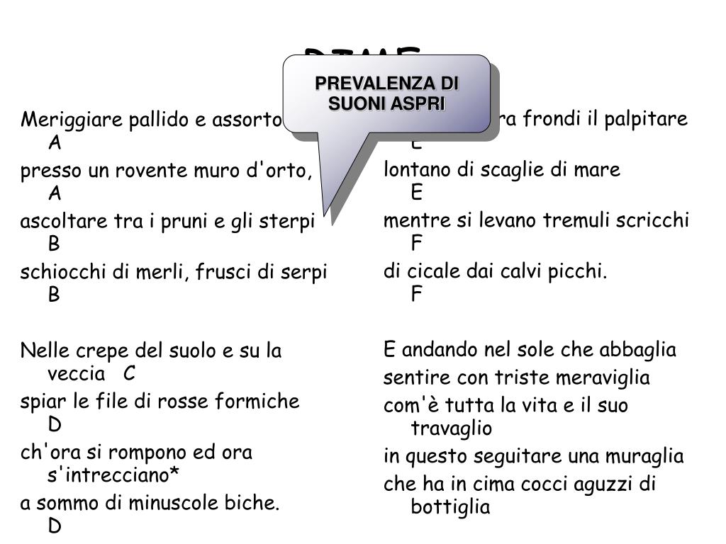 RIME PREVALENZA DI SUONI ASPRI Meriggiare pallido e assorto A presso un rovente muro d'orto, A ascoltare tra i pruni e gli sterpi B schiocchi di merli, frusci di serpi B Nelle crepe del suolo e su la veccia C spiar le file di rosse formiche D ch'ora si rompono ed ora s'intrecciano* a sommo di minuscole biche. D *rima ipermetra Osservare tra frondi il palpitare E lontano di scaglie di mare E mentre si levano tremuli scricchi F di cicale dai calvi picchi. F E andando nel sole che abbaglia sentire con triste meraviglia com'è tutta la vita e il suo travaglio in questo seguitare una muraglia che ha in cima cocci aguzzi di bottiglia