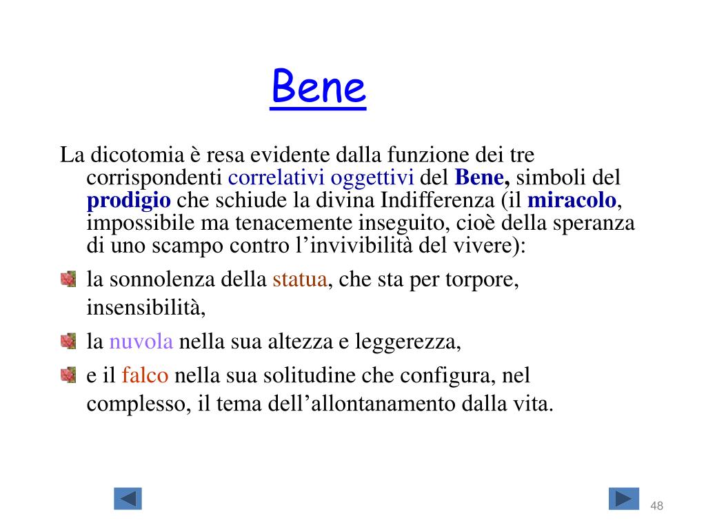 Bene La dicotomia è resa evidente dalla funzione dei tre corrispondenti correlativi oggettivi del Bene, simboli delprodigioche schiude la divina Indifferenza (il miracolo, impossibile ma tenacemente inseguito, cioè della speranza di uno scampo contro l’invivibilità del vivere): • la sonnolenza della statua, che sta per torpore, insensibilità, • la nuvola nella sua altezza e leggerezza, • e il falco nella sua solitudine che configura, nel complesso, il tema dell’allontanamento dalla vita.