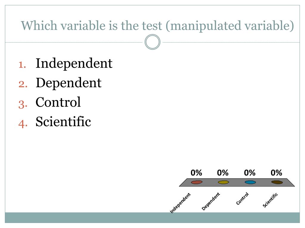 Which variable is the test (manipulated variable) • Independent • Dependent • Control • Scientific