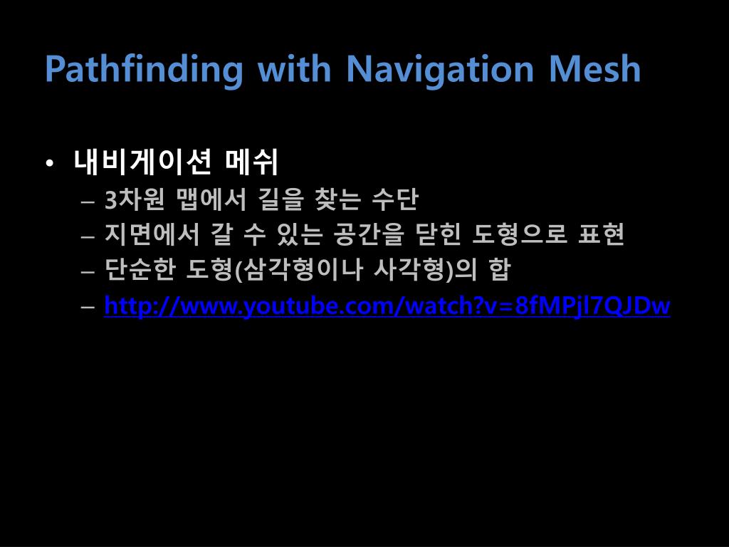 Pathfinding with Navigation Mesh • 내비게이션메쉬 • 3차원 맵에서 길을 찾는 수단 • 지면에서 갈 수 있는 공간을 닫힌 도형으로 표현 • 단순한 도형(삼각형이나 사각형)의 합 • http://www.youtube.com/watch?v=8fMPjl7QJDw