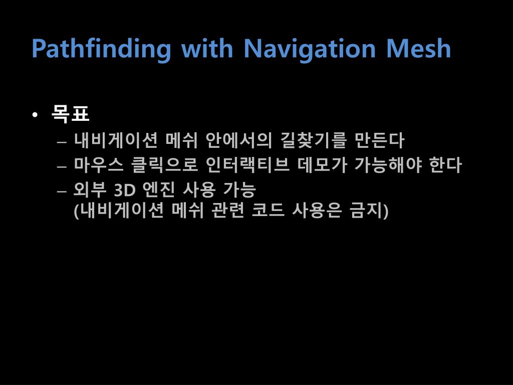 Pathfinding with Navigation Mesh • 목표 • 내비게이션메쉬 안에서의 길찾기를 만든다 • 마우스 클릭으로 인터랙티브 데모가 가능해야 한다 • 외부 3D 엔진 사용 가능(내비게이션메쉬 관련 코드사용은 금지)