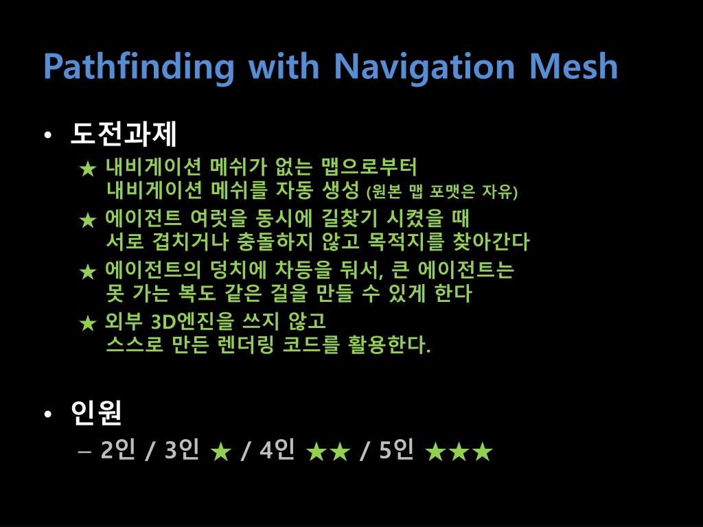 Pathfinding with Navigation Mesh • 도전과제 ★ 내비게이션메쉬가 없는 맵으로부터내비게이션메쉬를 자동 생성 (원본 맵 포맷은 자유) ★ 에이전트 여럿을 동시에 길찾기 시켰을 때서로 겹치거나 충돌하지 않고 목적지를 찾아간다 ★ 에이전트의 덩치에 차등을 둬서, 큰 에이전트는못 가는 복도 같은 걸을 만들 수 있게 한다 ★ 외부 3D엔진을 쓰지 않고스스로 만든 렌더링 코드를 활용한다. • 인원 • 2인 / 3인★/ 4인★★/ 5인★★★