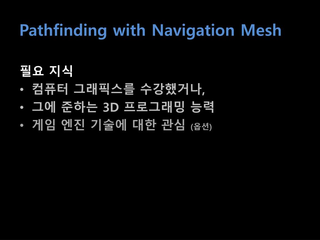 Pathfinding with Navigation Mesh 필요 지식 • 컴퓨터 그래픽스를 수강했거나, • 그에 준하는 3D 프로그래밍 능력 • 게임 엔진 기술에 대한 관심 (옵션)