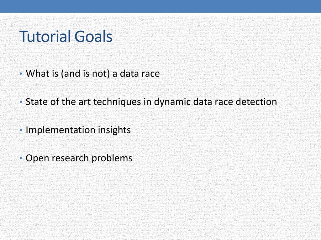 Tutorial Goals • What is (and is not) a data race • State of the art techniques in dynamic data race detection • Implementation insights • Open research problems