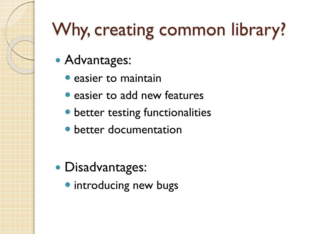 Why, creating common library? • Advantages: • easier to maintain • easier to add new features • better testing functionalities • better documentation • Disadvantages: • introducing new bugs