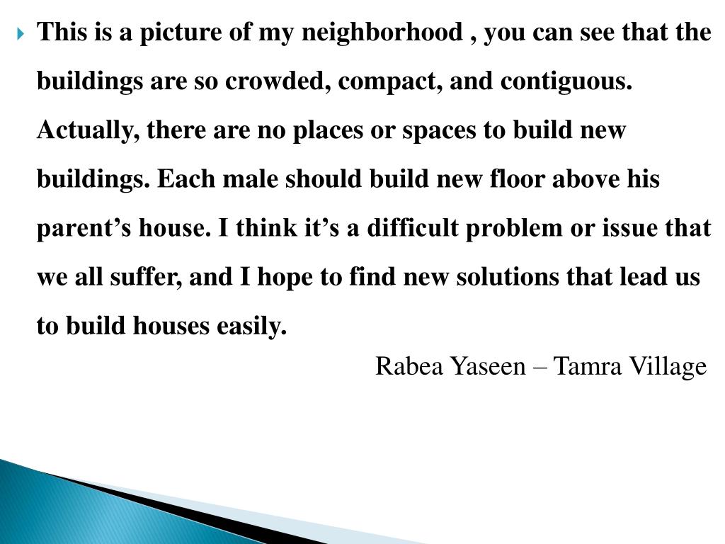 This is a picture of my neighborhood , you can see that the buildings are so crowded, compact, and contiguous. Actually, there are no places or spaces to build new buildings. Each male should build new floor above his parent’s house. I think it’s a difficult problem or issue that we all suffer, and I hope to find new solutions that lead us to build houses easily. RabeaYaseen – Tamra Village