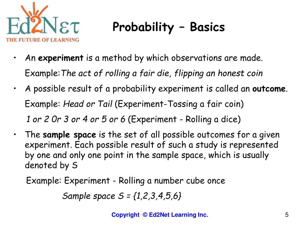 Probability – Basics • An experiment is a method by which observations are made. • Example:The act of rolling a fair die, flipping an honest coin • A possible result of a probability experiment is called an outcome. • Example: Head or Tail (Experiment-Tossing a fair coin) • 1 or 2 0r 3 or 4 or 5 or 6 (Experiment - Rolling a dice) • The sample space is the set of all possible outcomes for a given experiment. Each possible result of such a study is represented by one and only one point in the sample space, which is usually denoted by S • Example: Experiment - Rolling a number cube once • Sample space S = {1,2,3,4,5,6}