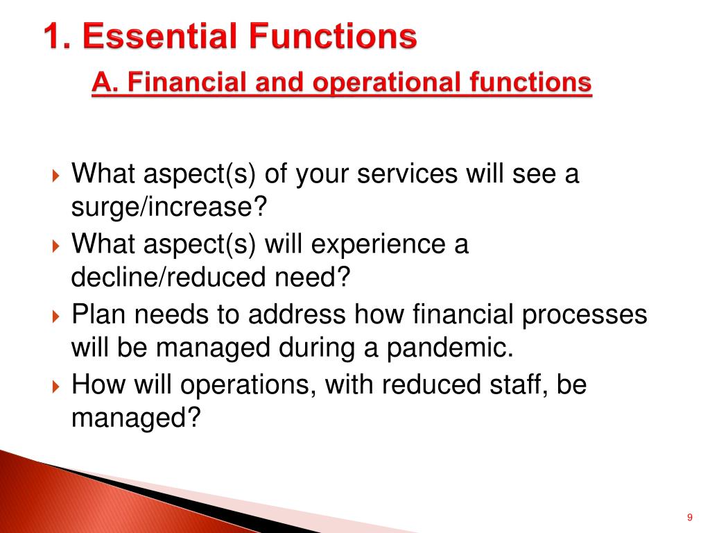 1. Essential FunctionsA. Financial and operational functions • What aspect(s) of your services will see a surge/increase? • What aspect(s) will experience a decline/reduced need? • Plan needs to address how financial processes will be managed during a pandemic. • How will operations, with reduced staff, be managed?