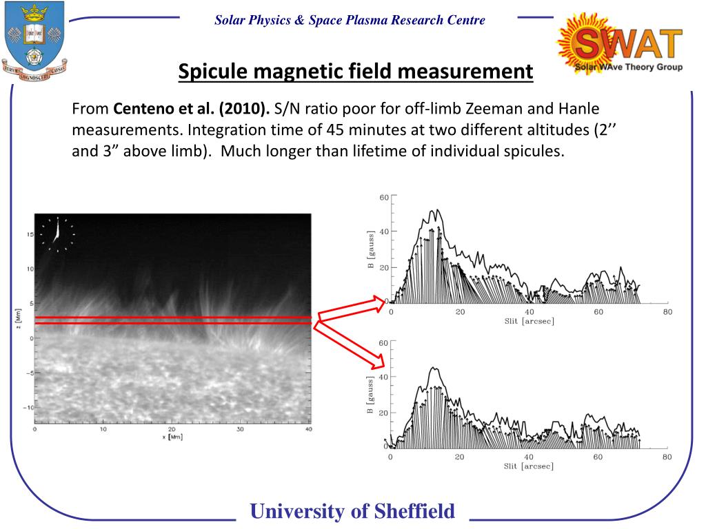 Solar Physics & Space Plasma Research Centre Spicule magnetic field measurement From Centeno et al. (2010). S/N ratio poor for off-limb Zeeman and Hanle measurements. Integration time of 45 minutes at two different altitudes (2’’ and 3” above limb). Much longer than lifetime of individual spicules. University of Sheffield