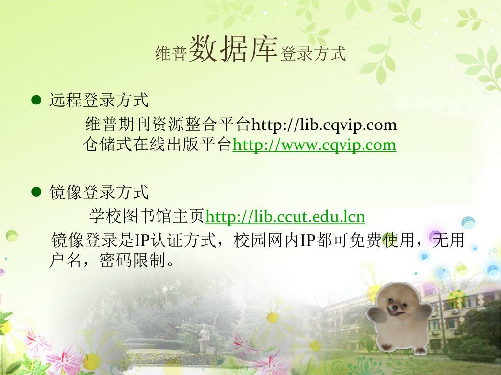 维普数据库登录方式 • 远程登录方式 维普期刊资源整合平台http://lib.cqvip.com仓储式在线出版平台http://www.cqvip.com • 镜像登录方式 学校图书馆主页http://lib.ccut.edu.lcn 镜像登录是IP认证方式,校园网内IP都可免费使用,无用户名,密码限制。