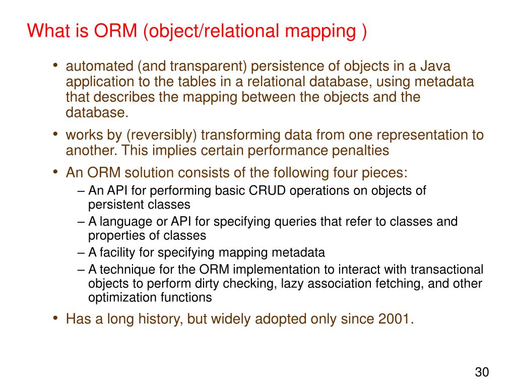 What is ORM (object/relational mapping ) • automated (and transparent) persistence of objects in a Java application to the tables in a relational database, using metadata that describes the mapping between the objects and the database. • works by (reversibly) transforming data from one representation to another. This implies certain performance penalties • An ORM solution consists of the following four pieces: • An API for performing basic CRUD operations on objects of persistent classes • A language or API for specifying queries that refer to classes and properties of classes • A facility for specifying mapping metadata • A technique for the ORM implementation to interact with transactional objects to perform dirty checking, lazy association fetching, and other optimization functions • Has a long history, but widely adopted only since 2001.