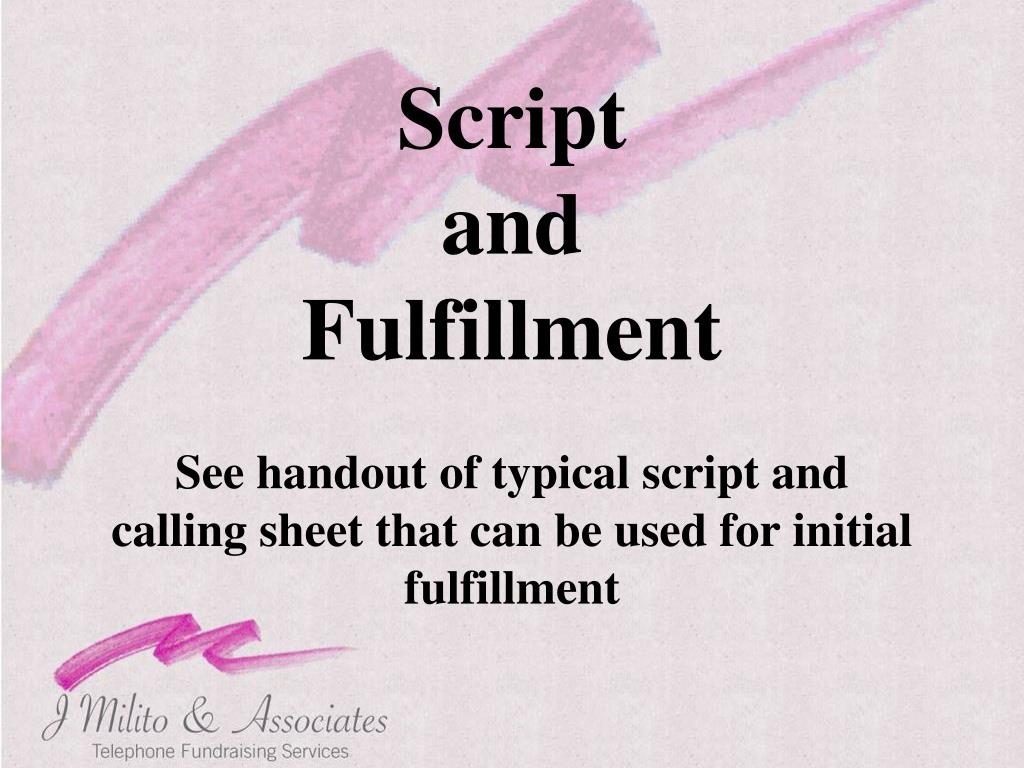 Script and Fulfillment • See handout of typical script and calling sheet that can be used for initial fulfillment