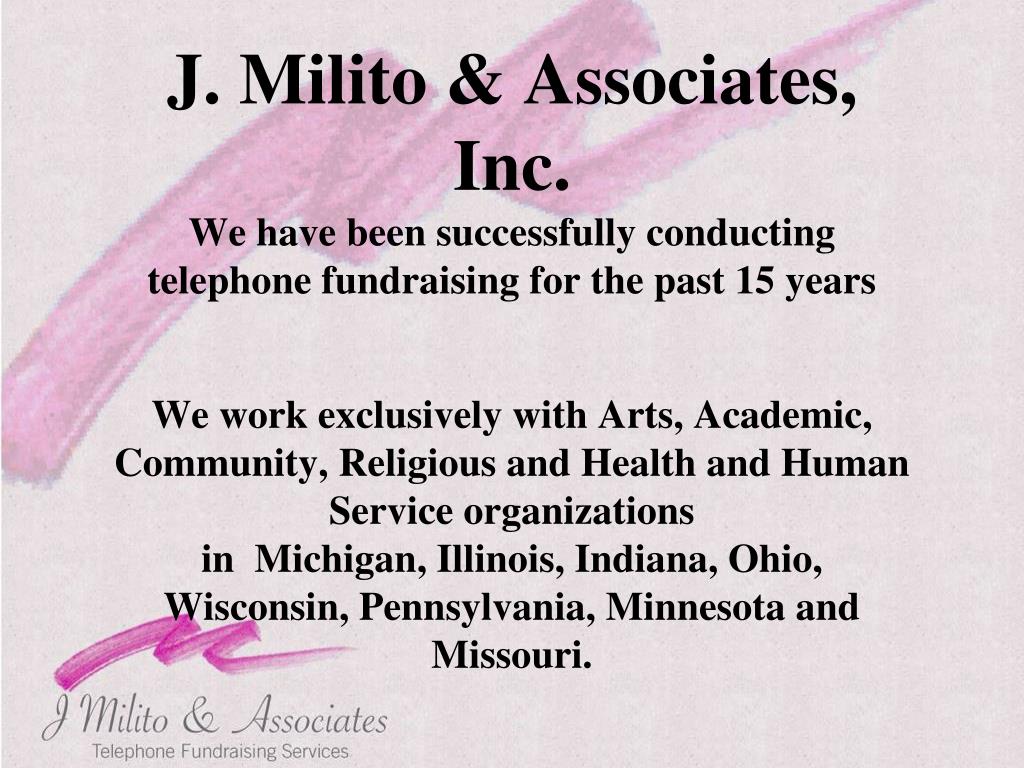 J. Milito & Associates, Inc. • We have been successfully conducting telephone fundraising for the past 15 years • We work exclusively with Arts, Academic, Community, Religious and Health and Human Service organizations • in Michigan, Illinois, Indiana, Ohio, Wisconsin, Pennsylvania, Minnesota and Missouri.