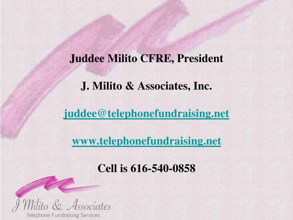 Juddee Milito CFRE, President • J. Milito & Associates, Inc. • juddee@telephonefundraising.net • www.telephonefundraising.net • Cell is 616-540-0858