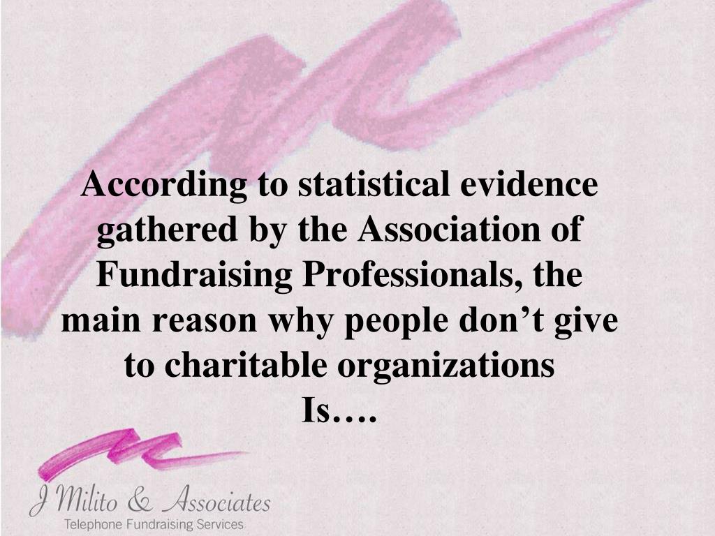 According to statistical evidence gathered by the Association of Fundraising Professionals, the main reason why people don’t give to charitable organizations • Is….