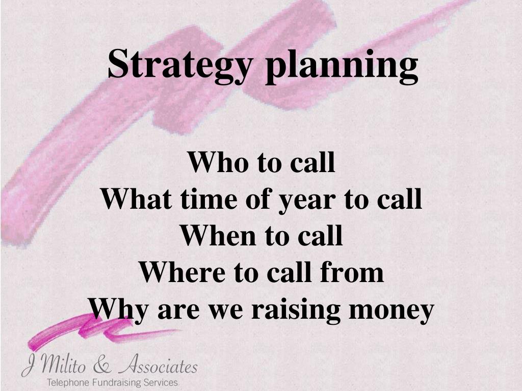 Strategy planning • Who to call • What time of year to call • When to call • Where to call from • Why are we raising money