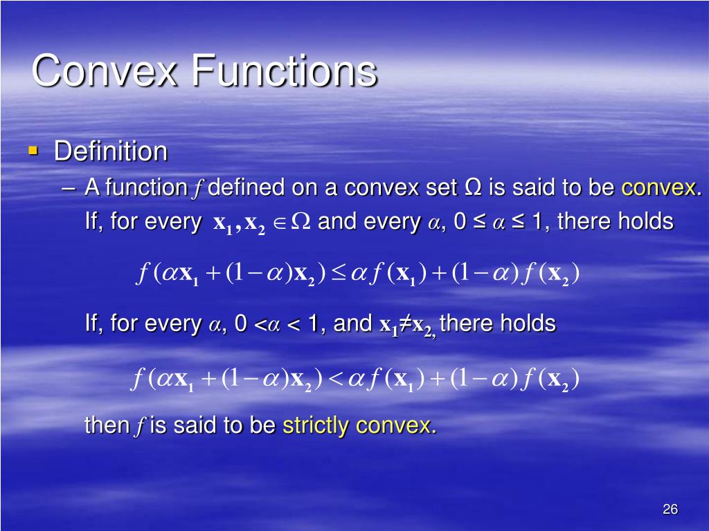 Convex Functions • Definition • A function f defined on a convex set Ω is said to be convex. If, for every and every α, 0 ≤ α ≤ 1, there holds If, for every α, 0 <α < 1, and x1≠x2, there holds then f is said to be strictly convex.