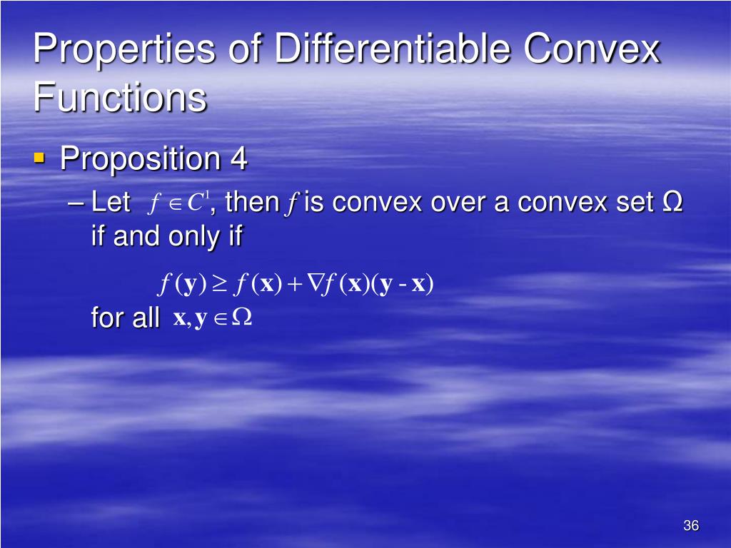 Properties of Differentiable Convex Functions • Proposition 4 • Let , then f is convex over a convex set Ω if and only if for all