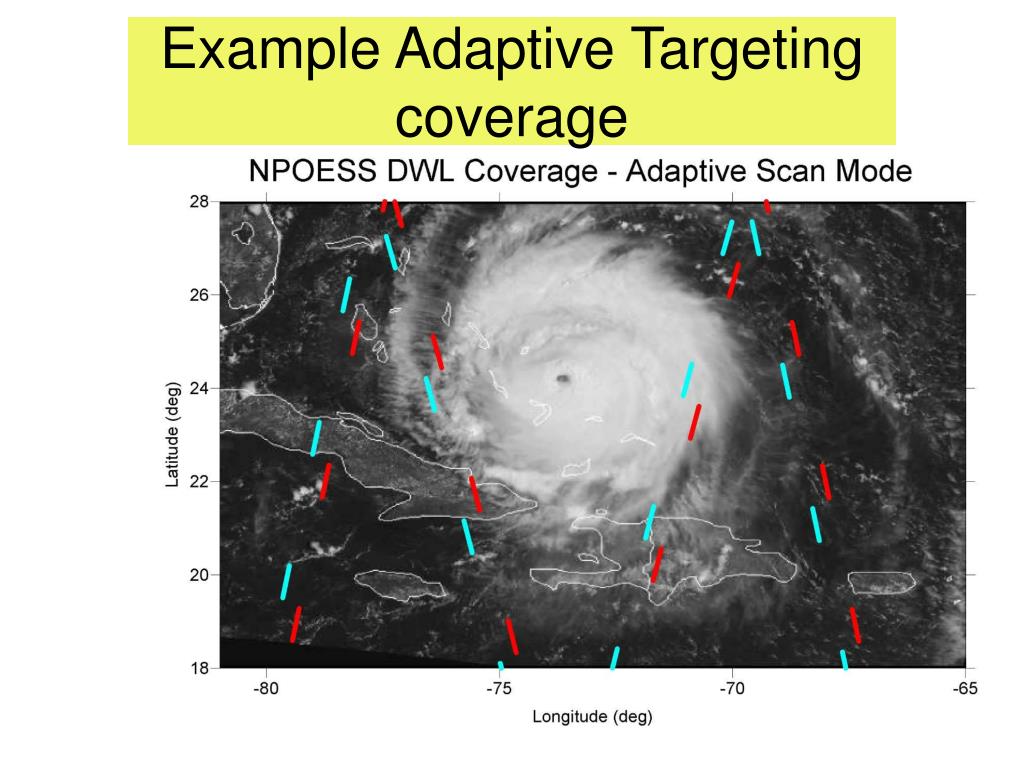 Primary Targets for Hybrid/AT* • Significant Shear regions • Requires contiguous observations in the vertical. Thus both direct and coherent detection technologies are needed. • Divergent regions • Requires some cross track coverage. Identified by NCEP adaptive targeting scheme(s) • Partly cloudy regions • Requires measurement accuracy weakly dependent upon shot integration (i.e., coherent detection). • Tropics • Tropical cyclones (in particular, hurricanes & typhoons). Requires penetration of high clouds and partly cloudy scenes. *AT: Adaptive Targeting