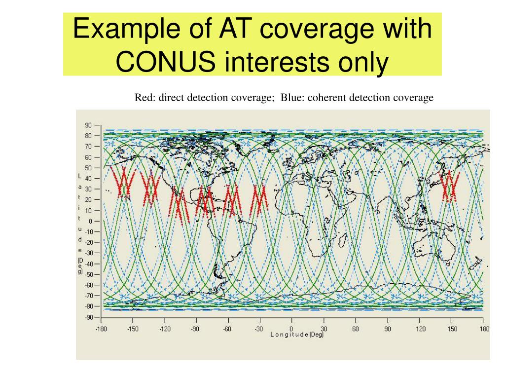 Example of AT coverage with CONUS interests only Red: direct detection coverage; Blue: coherent detection coverage