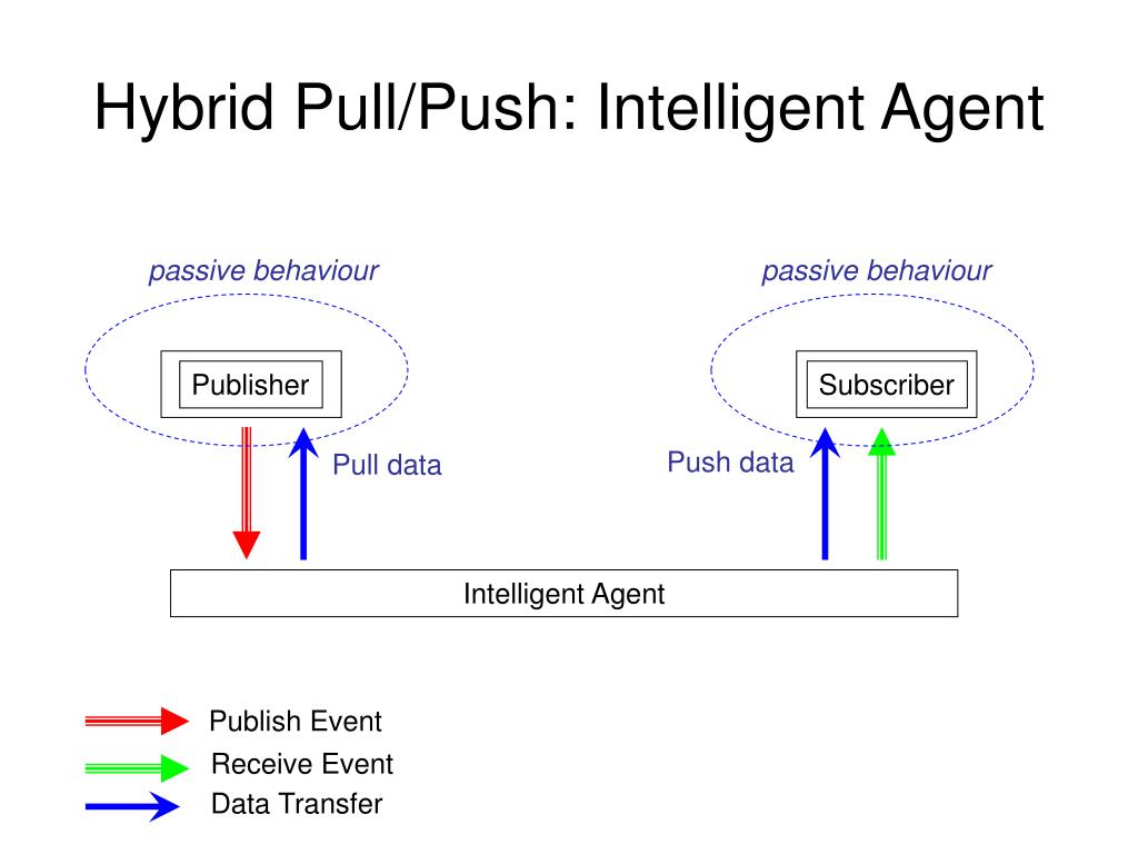 Hybrid Pull/Push: Intelligent Agent passive behaviour passive behaviour Publisher Subscriber Push data Pull data Intelligent Agent Publish Event Receive Event Data Transfer