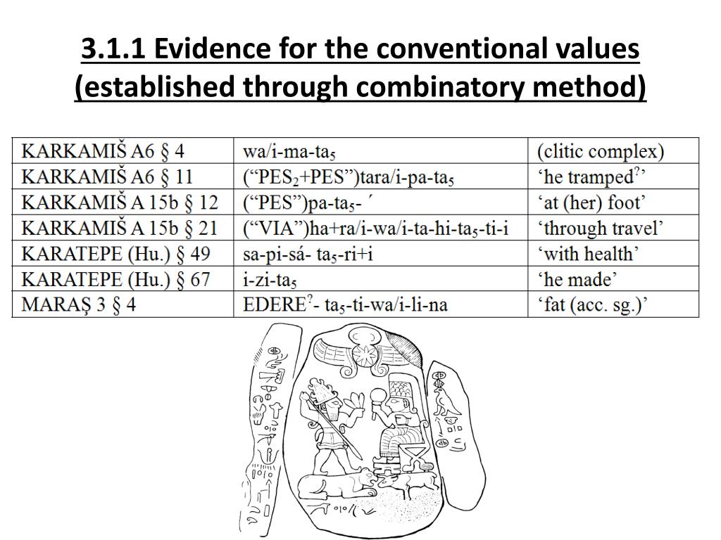 2.3 Combinatory approach (to a limited corpus). The identification of toponyms and personal names that were expected to occur in hieroglyphic inscriptions found in the particular areas led to the establishment of the values of most phonetic signs in the 1930s. 1. tu-wa/i-na-wa/i-ni-sa (URBS) ‘belonging to Tyane’ cf. Hitt. Tuwanuwa 2. ku+ra/i-ku-ma-wa/i-ní-i-sa (URBS) ‘belonging to Gurgum’, cf. Ass. Gurgume 3. i-ma-tú-wa/i-ni (URBS) ‘belonging to Hamath’, cf. Ass. Hammatti 4. mu-wa/i-ta-li-si-sà ‘of Muwattalli (PN)’, cf. Ass. Muttallu 5. Iu+ra/i-hi-li-na ‘Urahilina (PN)’, cf. Ass. Irhuleni 6. wa/i+ra/i-pa-la-wa/i-sa ‘Warpalawa (PN)’, cf. Ass. Urballa