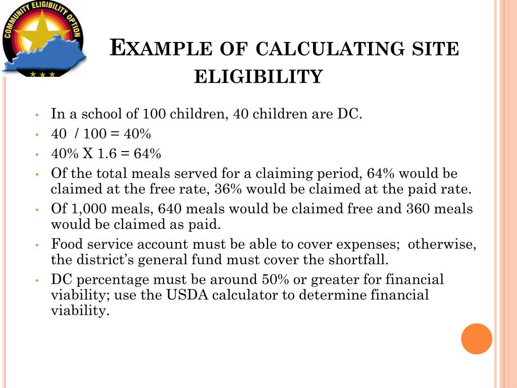 Example of calculating site eligibility • In a school of 100 children, 40 children are DC. • 40 / 100 = 40% • 40% X 1.6 = 64% • Of the total meals served for a claiming period, 64% would be claimed at the free rate, 36% would be claimed at the paid rate. • Of 1,000 meals, 640 meals would be claimed free and 360 meals would be claimed as paid. • Food service account must be able to cover expenses; otherwise, the district’s general fund must cover the shortfall. • DC percentage must be around 50% or greater for financial viability; use the USDA calculator to determine financial viability.