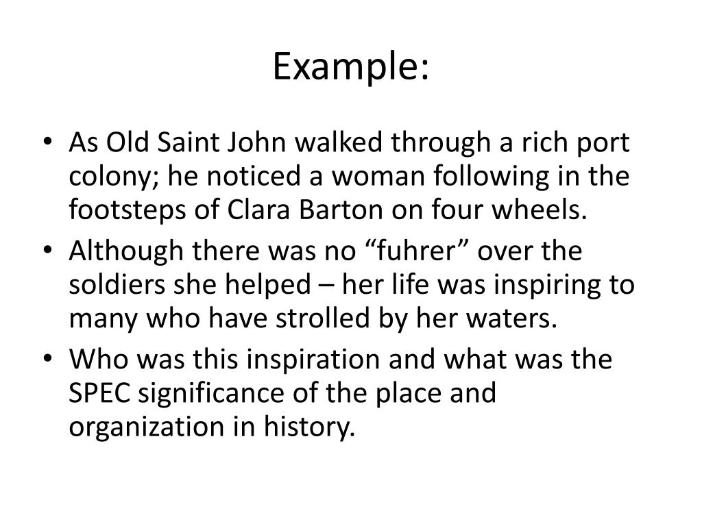 Example: • As Old Saint John walked through a rich port colony; he noticed a woman following in the footsteps of Clara Barton on four wheels. • Although there was no “fuhrer” over the soldiers she helped – her life was inspiring to many who have strolled by her waters. • Who was this inspiration and what was the SPEC significance of the place and organization in history.