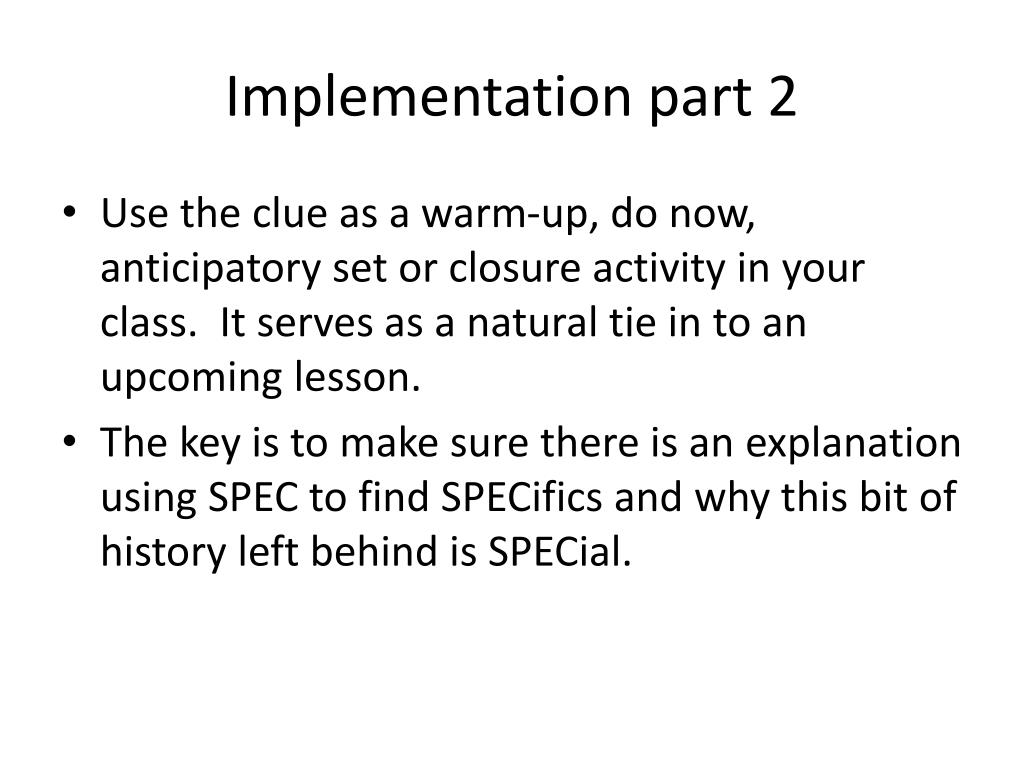 Implementation part 2 • Use the clue as a warm-up, do now, anticipatory set or closure activity in your class. It serves as a natural tie in to an upcoming lesson. • The key is to make sure there is an explanation using SPEC to find SPECifics and why this bit of history left behind is SPECial.