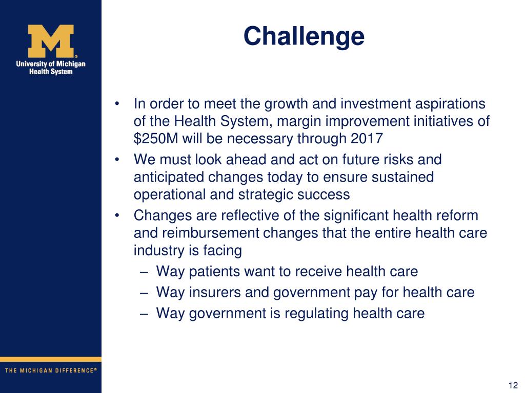 Challenge • In order to meet the growth and investment aspirations of the Health System, margin improvement initiatives of $250M will be necessary through 2017 • We must look ahead and act on future risks and anticipated changes today to ensure sustained operational and strategic success • Changes are reflective of the significant health reform and reimbursement changes that the entire health care industry is facing • Way patients want to receive health care • Way insurers and government pay for health care • Way government is regulating health care