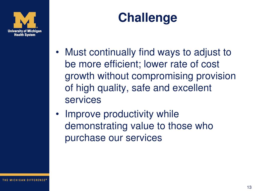 Challenge • Must continually find ways to adjust to be more efficient; lower rate of cost growth without compromising provision of high quality, safe and excellent services • Improve productivity while demonstrating value to those who purchase our services