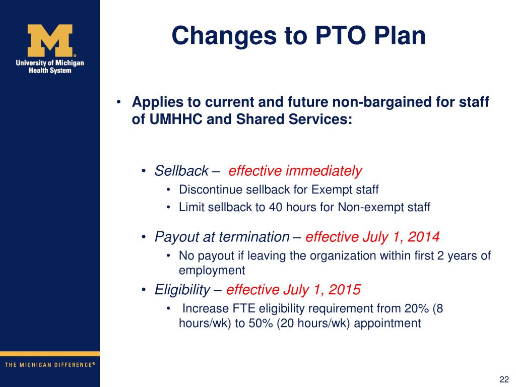 Changes to PTO Plan • Applies to current and future non-bargained for staff of UMHHC and Shared Services: • Sellback – effective immediately • Discontinue sellback for Exempt staff • Limit sellback to 40 hours for Non-exempt staff • Payout at termination – effective July 1, 2014 • No payout if leaving the organization within first 2 years of employment • Eligibility – effective July 1, 2015 • Increase FTE eligibility requirement from 20% (8 hours/wk) to 50% (20 hours/wk) appointment