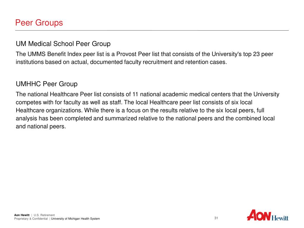 Peer Groups UM Medical School Peer Group The UMMS Benefit Index peer list is a Provost Peer list that consists of the University's top23 peer institutions based on actual, documented faculty recruitment and retention cases. UMHHC Peer Group The national Healthcare Peer list consists of 11 national academicmedical centers that the University competes with for faculty as well as staff. The local Healthcare peer list consists of six local Healthcare organizations. While there is a focus on the results relative to the six local peers, full analysis has been completed and summarized relative to the national peers and the combined local and national peers.