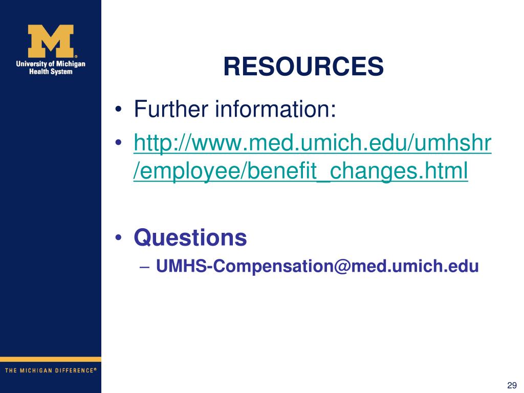 RESOURCES • Further information: • http://www.med.umich.edu/umhshr/employee/benefit_changes.html • Questions • UMHS-Compensation@med.umich.edu