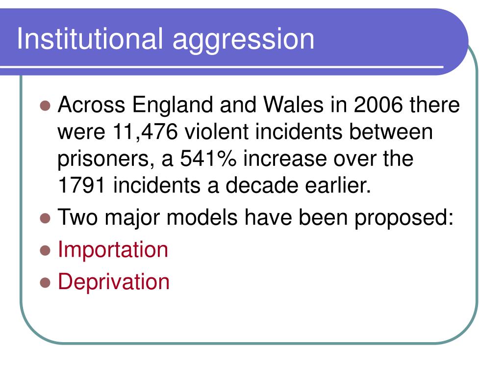 Institutional aggression Across England and Wales in 2006 there were 11,476 violent incidents between prisoners, a 541% increase over the 1791 incidents a decade earlier. Two major models have been proposed: Importation Deprivation