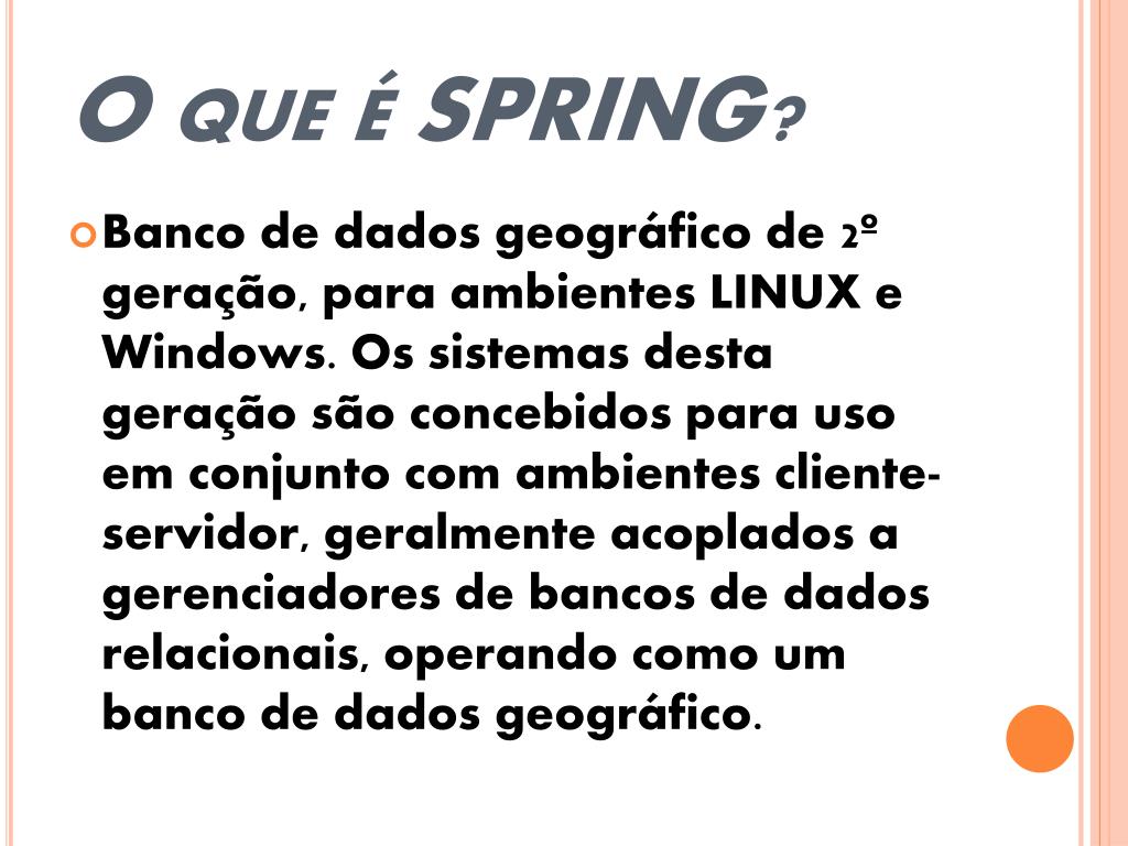 O que é SPRING? • Banco de dados geográfico de 2º geração, para ambientes LINUX e Windows. Os sistemas desta geração são concebidos para uso em conjunto com ambientes cliente-servidor, geralmente acoplados a gerenciadores de bancos de dados relacionais, operando como um banco de dados geográfico.