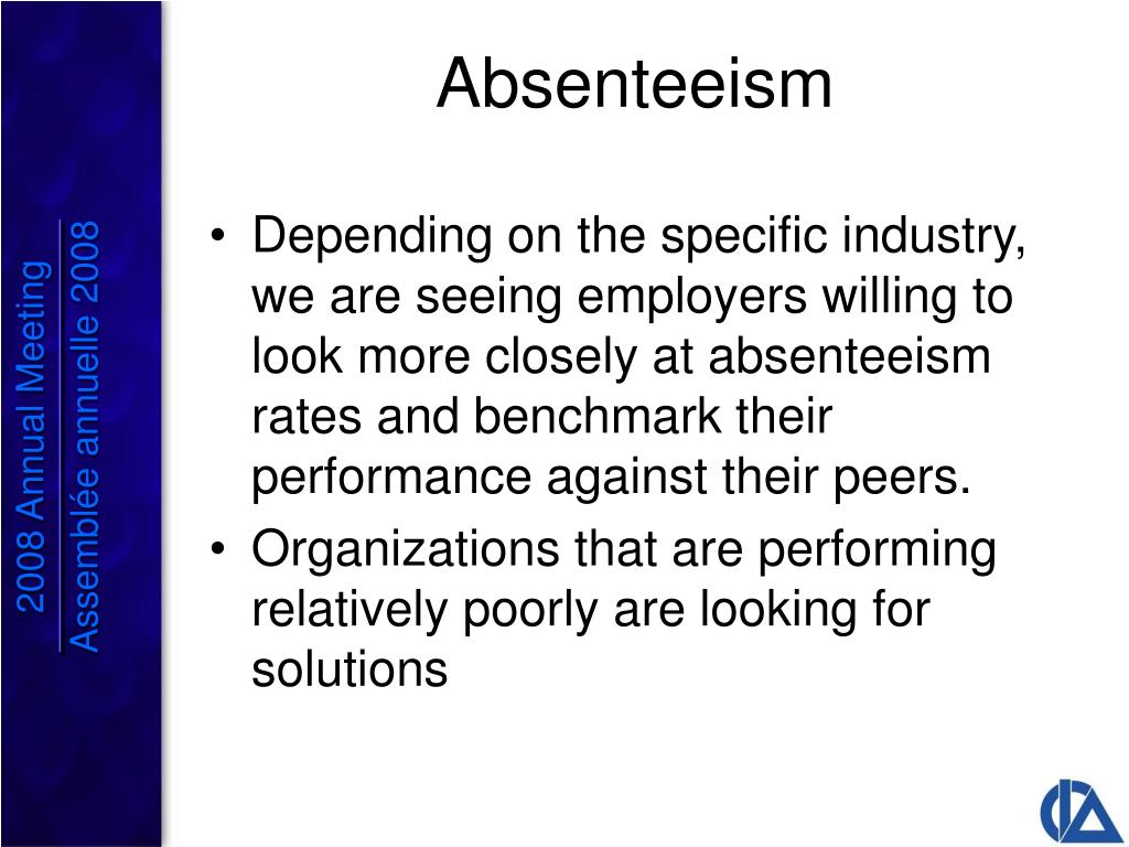 Depending on the specific industry, we are seeing employers willing to look more closely at absenteeism rates and benchmark their performance against their peers. Organizations that are performing relatively poorly are looking for solutions 2008 Annual Meeting Assemblée annuelle 2008 Absenteeism