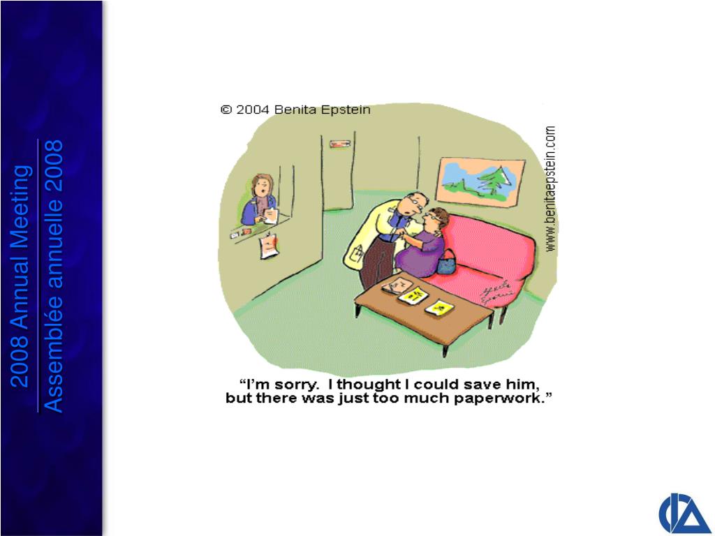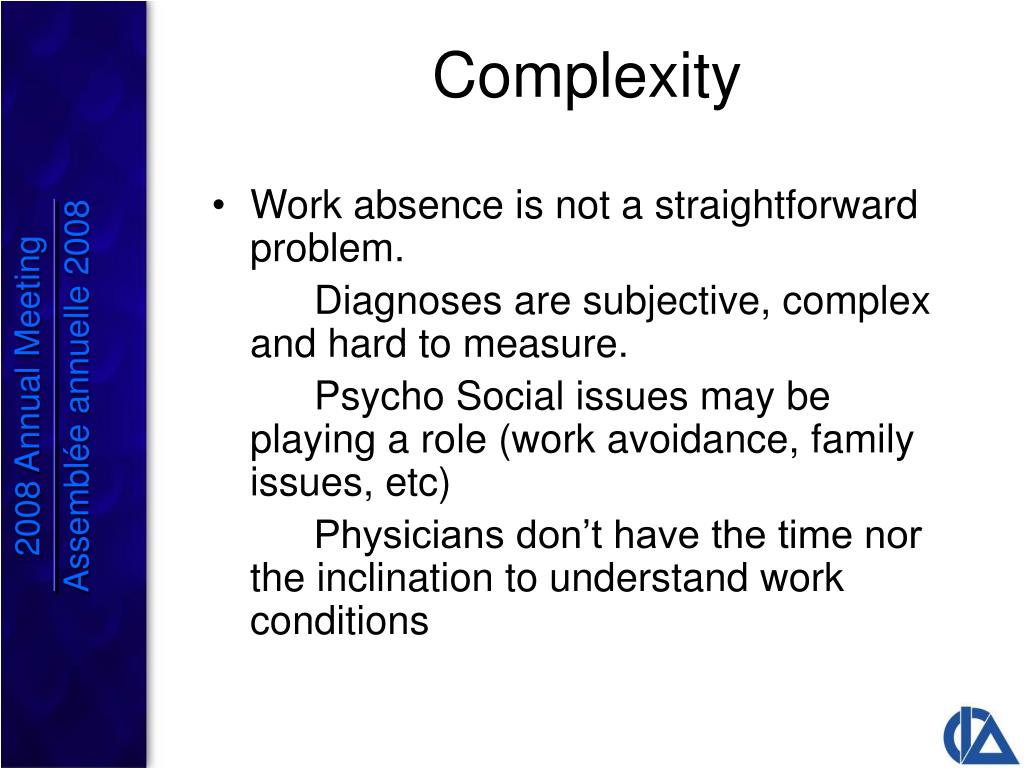 Work absence is not a straightforward problem. Diagnoses are subjective, complex and hard to measure. Psycho Social issues may be playing a role (work avoidance, family issues, etc) Physicians don’t have the time nor the inclination to understand work conditions 2008 Annual Meeting Assemblée annuelle 2008 Complexity