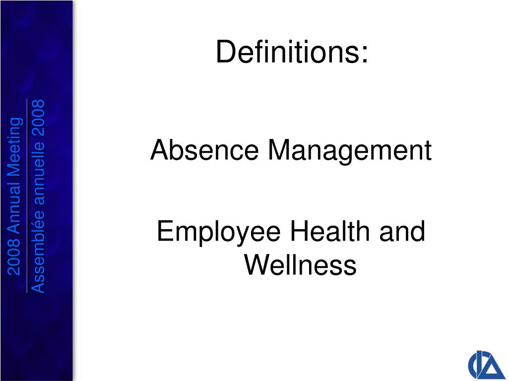 Absence Management Employee Health and Wellness 2008 Annual Meeting Assemblée annuelle 2008 Definitions: