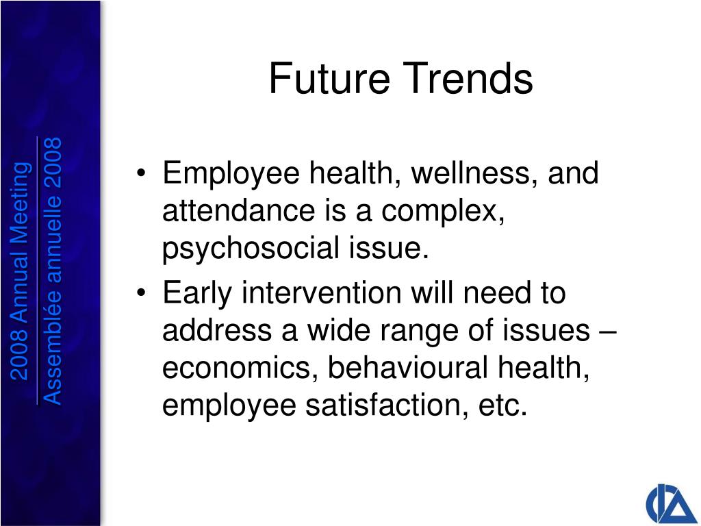 Employee health, wellness, and attendance is a complex, psychosocial issue. Early intervention will need to address a wide range of issues – economics, behavioural health, employee satisfaction, etc. 2008 Annual Meeting Assemblée annuelle 2008 Future Trends