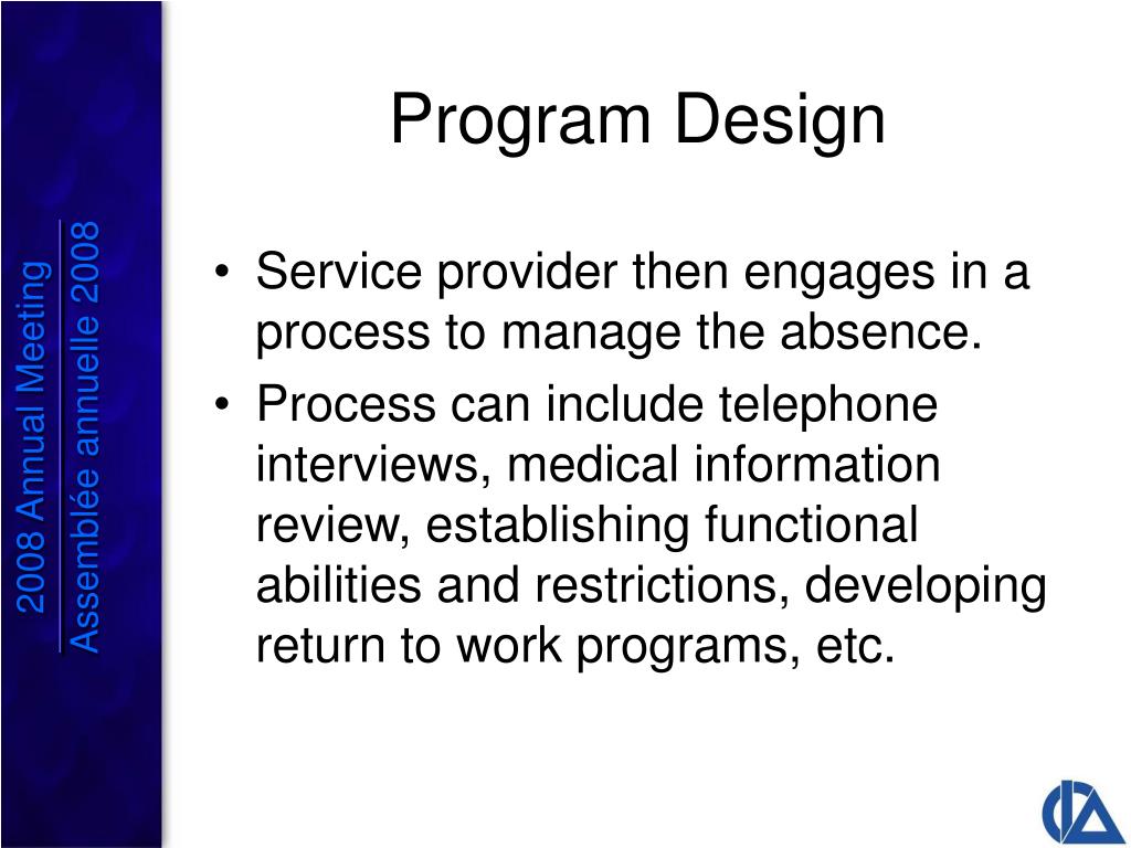 Service provider then engages in a process to manage the absence. Process can include telephone interviews, medical information review, establishing functional abilities and restrictions, developing return to work programs, etc. 2008 Annual Meeting Assemblée annuelle 2008 Program Design