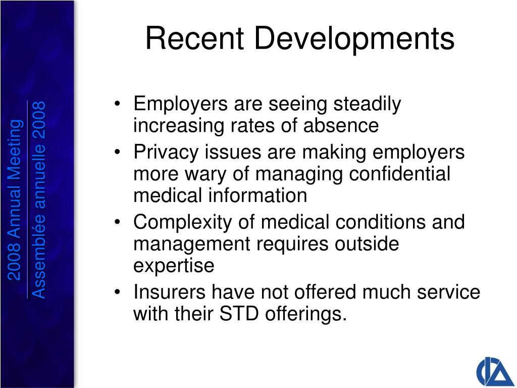 Employers are seeing steadily increasing rates of absence Privacy issues are making employers more wary of managing confidential medical information Complexity of medical conditions and management requires outside expertise Insurers have not offered much service with their STD offerings. 2008 Annual Meeting Assemblée annuelle 2008 Recent Developments