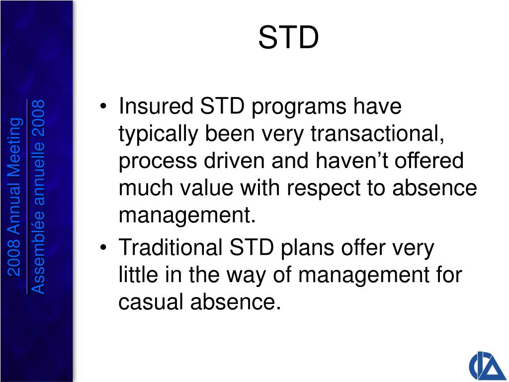 Insured STD programs have typically been very transactional, process driven and haven’t offered much value with respect to absence management. Traditional STD plans offer very little in the way of management for casual absence. 2008 Annual Meeting Assemblée annuelle 2008 STD