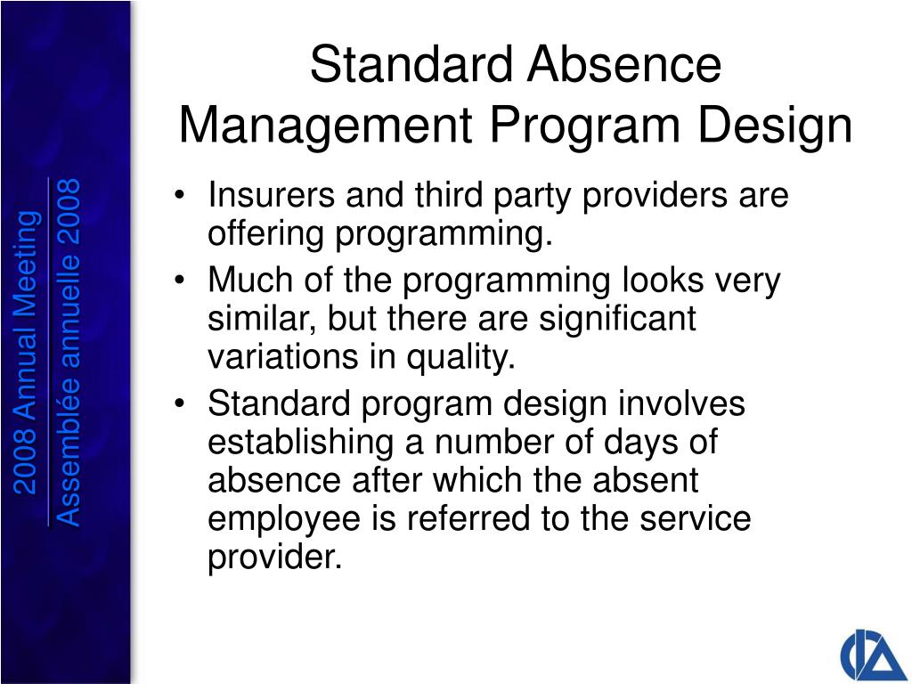Insurers and third party providers are offering programming. Much of the programming looks very similar, but there are significant variations in quality. Standard program design involves establishing a number of days of absence after which the absent employee is referred to the service provider. 2008 Annual Meeting Assemblée annuelle 2008 Standard Absence Management Program Design