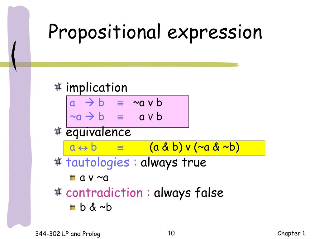 Propositional expression • implication a b ~a v b ~a b a V b • equivalence a b (a & b) v (~a & ~b) • tautologies : always true • a v ~a • contradiction : always false • b & ~b Chapter 1