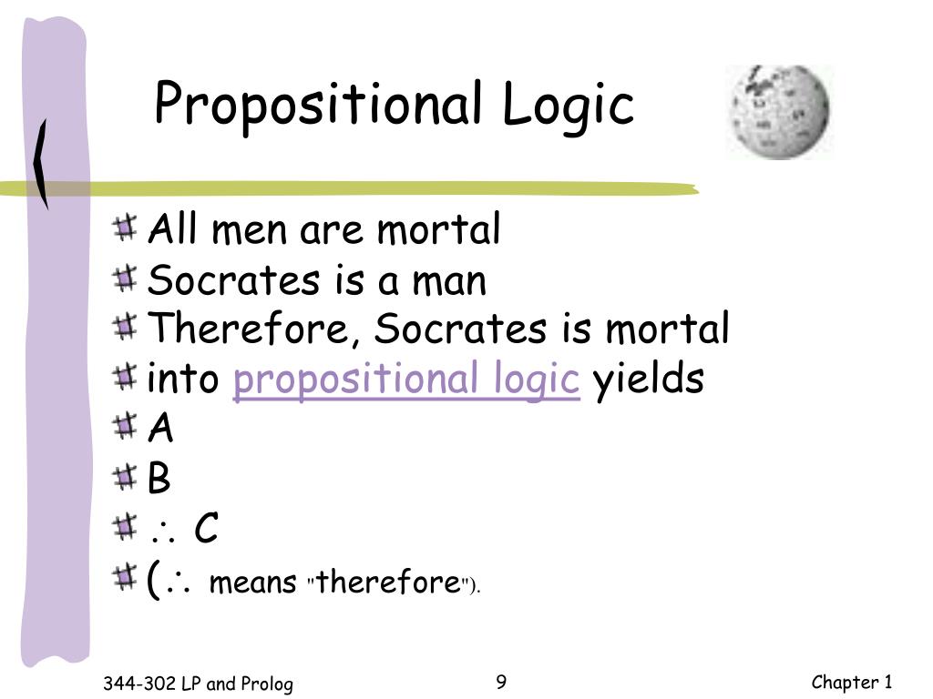 Propositional Logic • All men are mortal • Socrates is a man • Therefore, Socrates is mortal • into propositional logic yields • A • B • C • (means "therefore"). Chapter 1