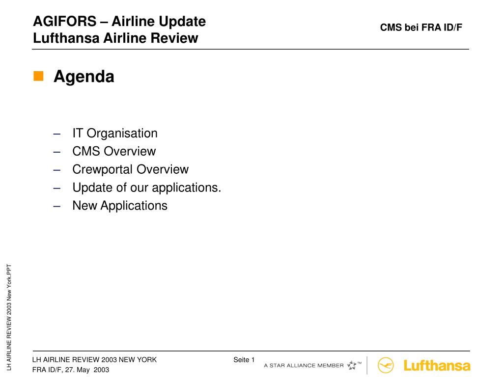 AGIFORS – Airline Update. LH AIRLINE REVIEW Helmuth Eggeling FRA ID/F New York, 27. May 2003. AGIFORS – Airline Update Lufthansa Airline Review. CMS bei FRA ID/F. Agenda IT Organisation CMS Overview Crewportal Overview Update of our applications. New Applications.